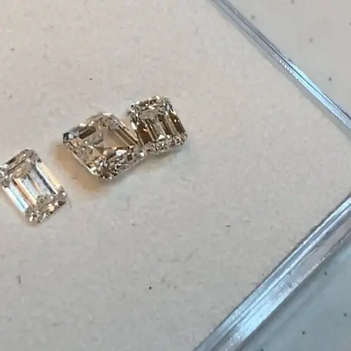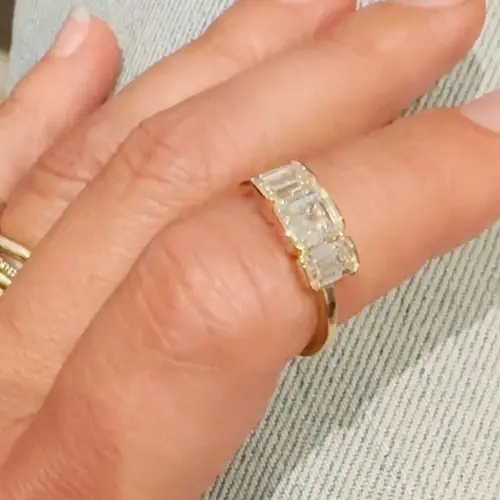 Our Bezel Rosette collection is an embodiment of modern elegance and timeless beauty. This striking custom piece features not one, but three stunning white diamonds, each embraced in a half-bezel setting. Two emerald-cut diamonds flank an exquisite asscher-cut diamond at the center, creating a harmonious trio that dazzles with every glance. The half-bezel setting not only showcases the unique cuts of these diamonds but also provides a contemporary twist on traditional designs, resulting in a ring that is both sophisticated and distinctive.